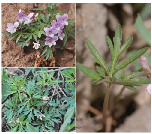 ●描述:多年生草本。基生叶叶片轮廓呈圆形、肾形或宽卵形,通常3全裂,两侧裂片常2深裂,中裂片3深裂;托叶近膜质,苍白色至淡绿色,约2/3以上与叶柄合生,离生部分边缘疏生细齿。花淡紫色至紫堇色;在花梗中部以下有2枚线形小苞片;萼片卵形,长圆状卵形或披针形,末端全缘或具1~2个细齿;上方花瓣长倒卵形,侧方花瓣长圆状倒卵形,里面基部有长须毛或疏生须毛;距明显,圆筒形,末端钝而稍膨胀;子房卵球形,无毛。蒴果长圆形或椭圆形。