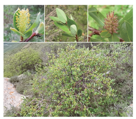 ●描述:直立矮小灌木。叶椭圆形或卵圆形,先端钝或急尖,基部圆形或钝,上面绿色,具疏柔毛或无毛,下面灰色或稍苍白色,有疏柔毛,后无毛,叶脉网状凸起,全缘;叶柄紫色。雄花序圆柱形,花密集,具2~3枚倒卵状椭圆形小叶;雌花序花密生,花序梗具2~3枚叶,子房卵形,无柄,花柱2裂,柱头2裂;苞片宽倒卵形,两面具毛,深紫色;腺体2个,常分裂,而基部结合,形成假花盘状。