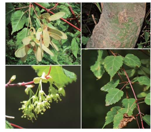 ●描述:落叶乔木,高7~12米。小枝细瘦,紫色或紫绿色。叶卵形或卵状椭圆形,基部圆形或近截形,先端尖尾,边缘有锐尖锯齿,侧脉4~6对。雌雄异株,总状花序,花黄绿色;雄花序很短,3~5朵花;雌花序长4~5厘米,5~8朵花;萼片、花瓣、雄蕊4枚,稀5~6枚雄蕊,子房紫色。翅果长3~5.5厘米,翅长圆形,张开成直角至近直立。