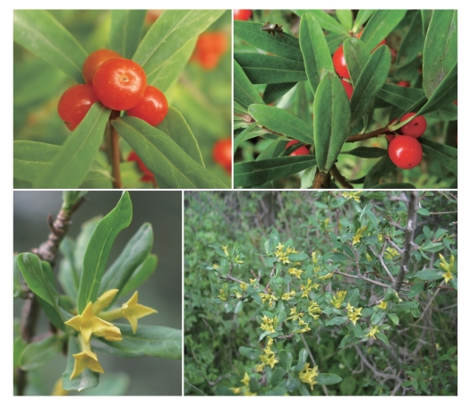 ●描述:落叶直立灌木。叶互生,膜质,常密生于小枝上部,倒披针形,先端钝或微突尖,基部楔形,全缘,下面带白霜,干后灰绿色,两面无毛,侧脉8~10对。花3~8朵组成顶生头状花序;无苞片;花黄色,微芳香;萼筒无毛,裂片4枚,卵状三角形,骤尖或渐尖;雄蕊8枚,2轮;花盘浅盘状,全缘;子房无毛,无花柱,柱头头状。果卵形,橙红或红色。
