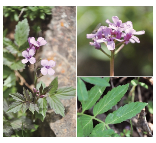 ●描述:多年生草本。茎单一,不分枝。基生叶有长叶柄;小叶3~5对,顶生小叶与侧生小叶的形态和大小相似,长椭圆形,顶端短尖,边缘具钝齿,基部呈楔形或阔楔形;茎生叶通常3枚,着生于茎的中、上部,有叶柄,小叶3~5对,与基生的相似,但较狭小。总状花序有10余朵花;外轮萼片长圆形,内轮萼片长椭圆形,边缘白色膜质,外面带紫红色;花瓣紫红色或淡紫色,倒卵状楔形,顶端截形,基部渐狭成爪。长角果线形,扁平。