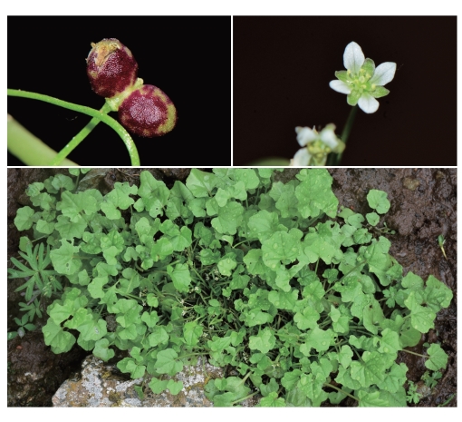 ●描述:一年生矮小草本。无茎或茎极短,全株无毛。叶基生,莲座状,心状圆形,基部心形,边缘波状,具掌状脉。花单生叶腋,或腋生总状花序;萼片宽卵形;花瓣白色,匙状倒卵形,基部有爪;雄蕊6枚,花丝白色,花药圆形;侧蜜腺4个,四角形;花柱短,柱头近2裂。短角果横卵形,顶端深凹,不裂;宿存花柱生于凹缺中。