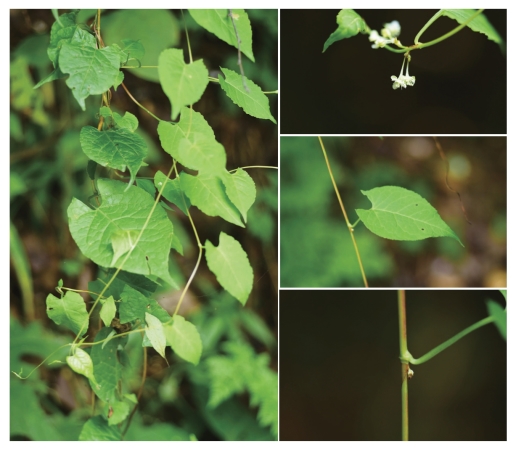 ●描述:半灌木。茎缠绕。叶簇生稀互生,叶片长卵形或卵形,近革质,顶端急尖,基部近心形;托叶鞘膜质,偏斜,褐色,易破裂。花序圆锥状,少分枝,稀疏,腋生或顶生;苞片膜质,顶端急尖,每苞内具3~6朵花;花梗下部具关节;花被5深裂,淡绿色或白色,花被片外面3片较大,背部具翅,果时增大,基部下延;花被果时外形呈倒卵形;雄蕊8枚;花柱3枚,极短,柱头头状。瘦果卵形,具3条棱,黑褐色,密被小颗粒。