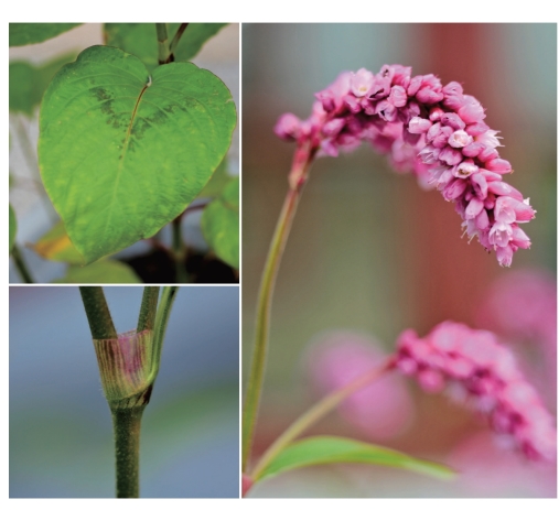 ●描述:一年生草本。茎直立,粗壮,上部多分枝,密被长柔毛。叶宽卵形或宽椭圆形,先端渐尖,基部圆或近心形,微下延,两面密被柔毛;托叶鞘被长柔毛,常沿顶端具绿色草质翅。穗状花序微下垂,数个花序组成圆锥状;苞片宽漏斗状,草质,绿色,被柔毛;花被5深裂,淡红或白色,花被片椭圆形;雄蕊7枚;花柱2枚,中下部连合。瘦果近球形,扁平,双凹,包于宿存花被内。