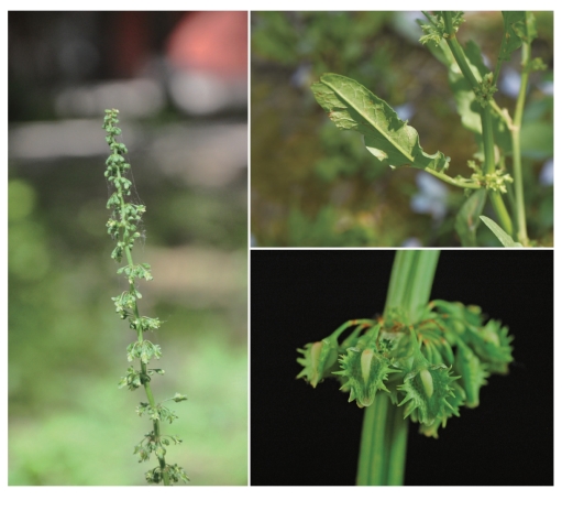 ●描述:一年生草本。茎直立,自基部分枝,具浅沟槽。茎下部叶长圆形或长椭圆形,顶端圆钝或急尖,基部圆形或近心形,边缘浅波状,茎生叶较小。花序总状,顶生和腋生,由数个再组成圆锥状花序,多花,轮状排列,花轮间断;花梗中下部具关节;外花被片椭圆形;内花被片果时增大,三角状卵形,顶端急尖,基部近圆形,网纹明显,全部具小瘤,小瘤边缘每侧具2~4个刺状齿。瘦果卵形,具3条锐棱,黄褐色。