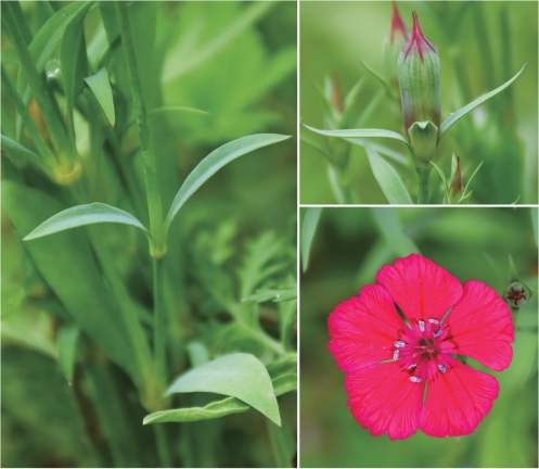 ●描述:多年生草本。带粉绿色;茎疏丛生,直立。叶片线状披针形,全缘或有细小齿,中脉较显。花单生枝端或数花集成聚伞花序;苞片4枚,卵形,顶端长渐尖,边缘膜质,有缘毛;花萼圆筒形,有纵条纹,萼齿披针形,顶端尖,有缘毛;花瓣倒卵状三角形,紫红色、粉红色、鲜红色或白色,顶缘不整齐齿裂,喉部有斑纹,疏生髯毛;雄蕊露出喉部外,花药蓝色;花柱线形。蒴果圆筒形,顶端4裂。