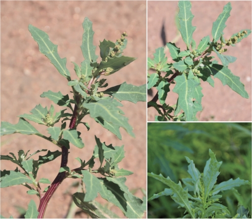 ●描述:一年生草本。茎平卧或外倾,具条棱及绿色或紫红色色条。叶片矩圆状卵形至披针形,肥厚,先端急尖或钝,基部渐狭,边缘具缺刻状牙齿,上面无粉,平滑,下面有粉而呈灰白色,有稍带紫红色;中脉明显,黄绿色。花两性兼有雌性,常数花聚成团伞花序,再于分枝上排列成有间断而通常短于叶的穗状或圆锥状花序;花被裂片3~4枚,浅绿色,稍肥厚,通常无粉,狭矩圆形或倒卵状披针形,先端通常钝;雄蕊1~2枚,花丝不伸出花被;柱头2枚,极短。