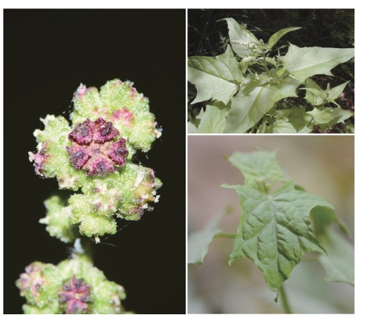 ●描述:一年生草本,稍被细粉粒。茎直立,粗壮,具淡黄色或紫色条棱,上部有疏分枝。叶宽卵形或卵状三角形,两面近同色,幼嫩时有粉粒,先端尖或渐尖,基部圆、平截或稍心形,边缘掌状浅裂,裂片三角形,不等大。花两性兼有雌性,常数个团集,在分枝上组成二歧式聚伞花序;花被5裂,裂片窄卵形,先端钝,背面具纵脊,边缘膜质;雄蕊5枚。胞果果皮膜质,常有白色斑点,与种子贴生。