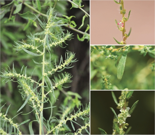 ●描述:一年生草本。被具节长柔毛。茎直立,基部分枝。叶扁平,线状披针形或披针形,先端短渐尖,基部渐窄成短柄,常具3条主脉。花两性兼有雌性,常1~3朵簇生上部叶腋;花被近球形,5深裂,裂片近角形,翅状附属物角形或倒卵形,边缘微波状或具缺刻;雄蕊5枚,花丝丝状;柱头2枚,丝状,花柱极短。胞果扁,果皮膜质,与种子贴伏。