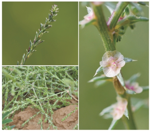 ●描述:一年生草本。疏生短硬毛。茎直立,基部分枝,具绿色或紫红色条纹;枝伸展,生短硬毛或近无毛。叶圆柱状,条形,先端具刺尖,基部稍宽并具膜质边缘,下延。花单生于枝上部苞腋,组成穗状花序;苞片卵形,紧贴于轴,先端渐尖,背面具微隆脊,小苞片窄披针形;花被片卵状披针形,膜质,果时硬化,背面的附属物呈鸡冠状,花被片附属物以上部分近革质,内折,先端膜质;柱头丝状,花柱很短。