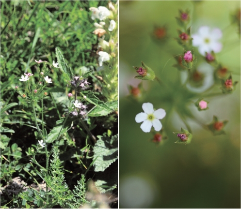 ●描述:一年生或二年生草本。茎直立,被柔毛。基生叶常早枯,茎生叶互生;叶椭圆形或卵状椭圆形,先端锐尖或稍钝,具软骨质骤尖头,基部短渐窄或近圆,边缘增厚,软骨质,两面均被柔毛。伞形花序多花,常生于无叶的枝端;苞片卵形或卵状披针形,叶状;花梗疏被短柄腺体;花萼钟状,分裂达中部,裂片三角形,具小尖头;花冠白或粉红色,裂片小,长圆形,微伸出花萼。蒴果长圆形,稍长于花萼。