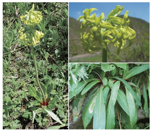 ●描述:多年生草本。全株无粉。叶丛基部无鳞片,叶柄不明显或长达叶片1/2,稀与叶片等长;叶椭圆形、椭圆状倒披针形或倒披针形,先端钝圆或稍尖,基部渐窄,具小牙齿,稀近全缘。伞形花序1~3轮,每轮5~9朵花;花梗被微柔毛;花萼筒状,分裂达全长1/3~1/2,裂片三角形或披针形;花冠黄绿或淡红色,冠筒与花萼近等长或长于花萼;裂片线形,向外反折。蒴果筒状,长于花萼。