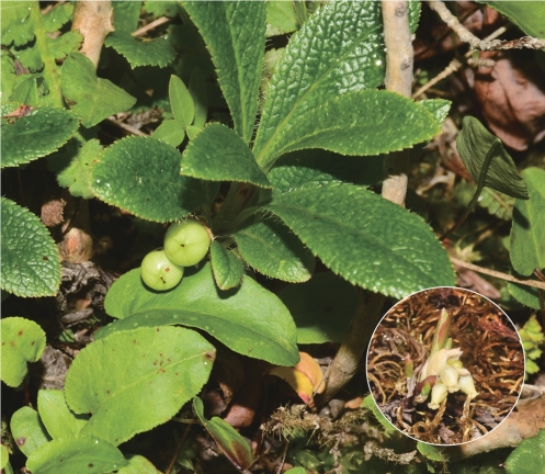 ●描述:落叶矮小灌木。茎匍匐于地面。叶簇生枝顶,纸质,倒披针形或倒狭卵形,先端钝或突尖,向基部渐变狭,下延于叶柄,边缘具粗钝锯齿,疏被缘毛,表面亮绿色,背面较淡;叶柄疏被白色长毛。花常1~3朵成总状花序;苞片披针形;花萼小,5裂,花冠卵状坛形,淡黄绿色;口部5浅裂;雄蕊10枚;子房无毛,花柱无毛。浆果球形,无毛,有光泽,成熟时鲜红色,多汁。