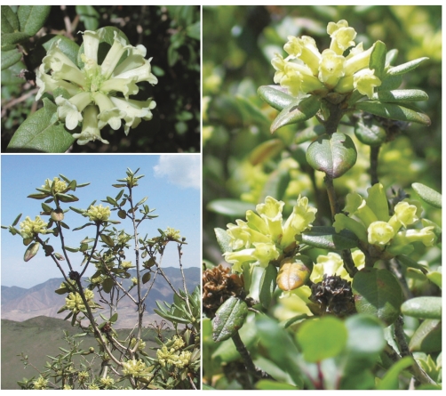 ●描述:常绿灌木。叶芳香,革质,卵状椭圆形、宽椭圆形至卵形,顶端圆钝具小突尖头,基部圆或稍截形,上面蓝绿色,无光泽,疏被鳞片或无。花序头状顶生,有花10~20朵;花萼发达,淡黄红色或淡绿色,裂片长圆状倒卵形或椭圆状卵形,边缘蚀痕状;花冠狭筒状漏斗形,淡黄绿或绿白色,罕粉色,有浓烈的芳香,花管内面特别在喉部密被髯毛,裂片开展。