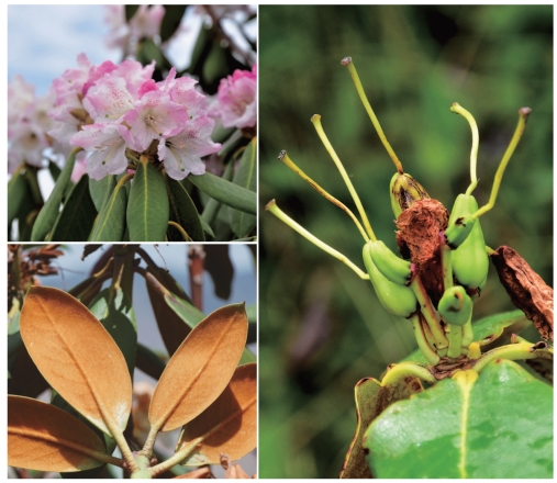 ●描述:常绿灌木。叶革质,常集生于枝端,叶片卵状椭圆形至椭圆形,先端钝,具小尖头,基部圆形或略呈心形,上面深绿色,侧脉11~12对,下面初被薄层灰白色、黄棕色至锈黄色,多少黏结的毛被,由具长芒的分枝毛组成,以后毛陆续脱落,变为无毛。顶生伞房状伞形花序,有花10~15朵;花萼小,具5个半圆形齿裂;花冠钟形,白色至粉红色,筒部上方具紫红色斑点,裂片5枚;雄蕊10枚,不等长;花柱无毛,柱头头状。蒴果长圆柱形。