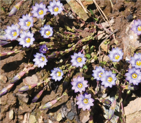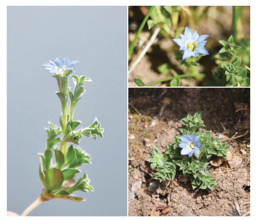 ●描述:一年生矮小草本。茎基部多分枝。叶缘厚软骨质,叶柄白色膜质;基生叶卵形、宽卵形或卵状椭圆形;茎生叶倒卵状匙形或匙形。花单生枝顶;花萼倒锥状筒形,被细乳突,裂片外反,卵圆形或卵形,基部圆,缢缩成爪,边缘软骨质,密被细乳突;花冠蓝色,筒状漏斗形,裂片卵状三角形,褶卵形,全缘或具细齿。蒴果倒卵状长圆形,顶端具宽翅,两侧具窄翅。