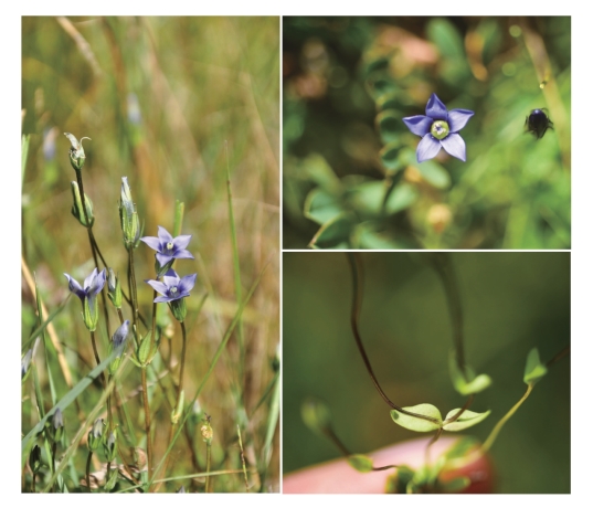 ●描述:一年生草本。茎直伸,基部或下部分枝,枝开展。基生叶早落;茎生叶长圆形、椭圆形或长圆状披针形,先端钝,边缘微粗糙。聚伞花序常顶生及腋生;花5数,花萼绿色,深裂,裂片卵状长圆形、椭圆形或线状披针形,边缘及背面中脉黑色,裂片间弯缺窄长;花冠蓝或淡蓝色,漏斗形,裂片长圆形,先端纯;子房无柄,披针形。蒴果无柄,顶端稍外露。