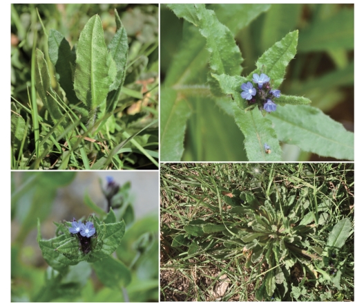 ●描述:一年生草本。茎常自下部分枝。基生叶和茎下部叶有柄,其余无柄,倒披针形至线状长圆形,边缘有微波状小牙齿。苞片卵形至线状披针形;花萼5裂至基部,裂片钻形;花冠蓝紫色,有时紫红色,无毛,筒下部稍膝曲,裂片开展,宽度稍大于长度,附属物疣状至鳞片状,密生短毛;雄蕊着生花冠筒中部之下,花丝极短;柱头球形,2裂。小坚果肾形,淡褐色,表面有网状皱纹和小疣点。