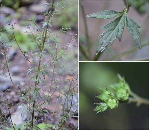 ●描述:一年生草本。叶柄有沟,具狭翅;叶片三角形或近卵形,3深裂,裂片边缘具齿,基部下延。花序为由松散具长梗的聚伞花序组成的圆锥花序;苞叶与茎叶同形,变小;小苞片线形;花萼钟形,萼齿5个,近整齐,三角形,渐尖;花冠蓝色或紫蓝色,冠筒内藏或略长于花萼,冠檐二唇形,上唇2裂,长圆状卵形或卵形,下唇略大,3裂,中裂片近圆形,侧裂片与上唇裂片近同形;雄蕊4枚,花丝无毛,伸出雄蕊约1/2。花柱略超出雄蕊,先端不相等2浅裂。小坚果倒卵状三棱形。●生境:生于田边旷野、河岸沙地、开阔路边及溪旁。●分布:石佛沟路边、沟渠旁偶见分布。
