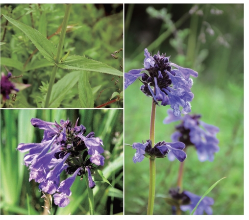 ●描述:多年生草本。茎被倒向短硬毛或变无毛,其间散布淡黄色腺点。叶卵状披针形、宽披针形至披针形,向上渐变小,先端急尖,基部浅心形,边缘具密的牙齿状锯齿。轮伞花序下部远离,顶部的3~6轮密集成穗状;苞叶具细锯齿至全缘,苞片线形或线状披针形;花萼喉部极斜,上唇3枚齿宽披针形或披针状长三角形,下唇2枚齿狭披针形;花冠紫色或蓝色,冠筒向上骤然宽大,冠檐二唇形,上唇裂至中部成2钝裂片,下唇中裂片肾形,先端中部具弯缺,边缘齿状,侧裂片半圆形。