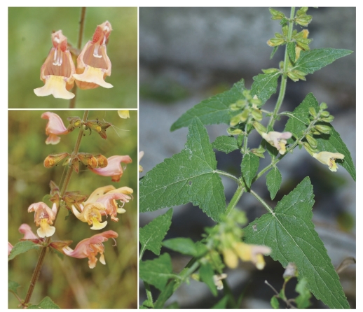 ●描述:一年生或二年生草本。茎多分枝,被短柔毛及腺长柔毛。叶3裂,三角状戟形或箭形,先端渐尖或尖,基部心形,具卵形裂片,具锯齿或圆齿。轮伞花序具2~4朵花,组成总状或总状圆锥花序,被短柔毛及腺长柔毛苞片窄披针形,全缘或具2~4枚齿;花萼钟形,密被黄褐色腺点,沿脉及边缘被腺长柔毛;上唇三角形,具3个靠合短尖头,下唇2斜三角形齿;花冠黄色,被柔毛,冠筒内具柔毛环,上唇长圆形,能育雄蕊伸出,药隔弧曲,上臂较下臂稍长。