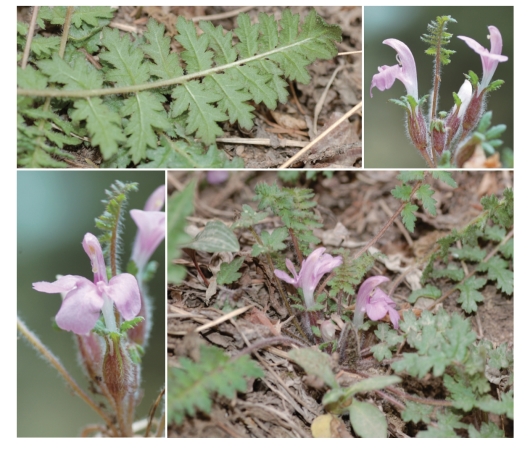 ●描述:多年生草本。茎细短,被毛,基部被披针形或卵形黄褐色膜质鳞片及枯叶柄。叶柄铺散,密被柔毛;叶长圆状披针形,羽状全裂,裂片8~14对,卵形,羽状深裂,有缺刻状锯齿。花腋生;花梗、花萼被长柔毛,萼齿5,叶状;花冠紫色,花冠筒直伸,较萼长,上唇镰状弓曲,先端尖,顶部稍钝,下唇稍长于上唇,伸展,裂片圆形;花丝均被长毛。蒴果卵圆形,全为膨大宿萼所包。