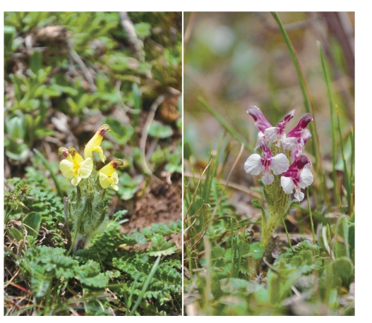 ●描述:多年生草本。茎多少有绵毛。叶多基生,叶片线状披针形至线形,羽状全裂,裂片常紧密排列,锐头至钝头,缘有锯齿,齿常有胼胝而多反卷,茎叶常极少,仅1~2枚。花序顶生;苞片披针形至线状披针形,几全缘或上部有齿;萼狭而圆筒形,齿5枚;花冠多二色,盔端紫黑色,其余黄白色,有时下唇及盔的下部亦有紫斑,管在近端处多少向前膝曲使花前俯,盔与管的上段同其指向,额圆形,前缘之端稍稍作三角形凸出,下唇侧裂斜椭圆形,甚大于多少圆形的中裂。