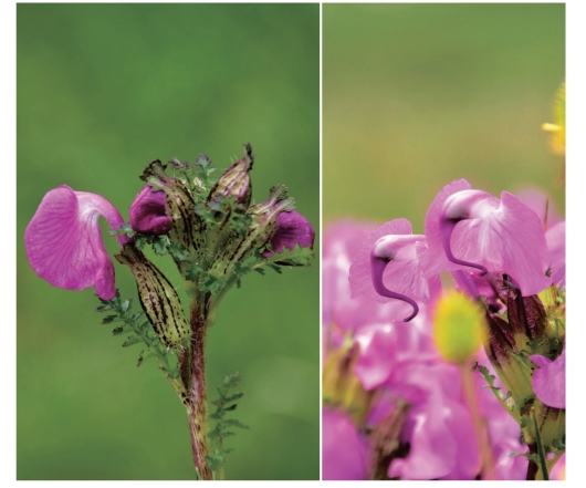 ●描述:多年生草本。茎直立,或更常弯曲上升,不分枝。叶基生者常成密丛,叶片羽状全裂,裂片9~12对,卵形;茎叶少数。花成顶生的亚头状总状花序或多少伸长;苞片叶状;萼管前方开裂至一半,常有美丽的色斑,齿5枚,后方1枚披针形全缘,其余4枚较大;花冠玫瑰色,盔直立部分前缘转角处偶然有1对小齿,而在额部则仅极偶然有小鸡冠状凸起;喙半环状卷曲;下唇基部宽心脏形,伸至管的后方。蒴果披针状卵形,端多少斜截形,有小凸尖。