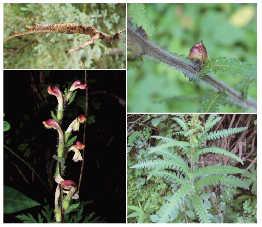 ●描述:多年生草本。根茎粗壮,肉质,上部以细而鞭状的根茎连着于生在地表下而密生须根的根颈之上。上部多分枝,多毛。叶全茎生,无柄,抱茎,披针状线形,羽状深裂,裂片达24对,长圆形或披针形,被毛,有重锯齿。花序长穗状,被腺毛;下部苞片叶状,上部的卵形,较花萼长;花萼密被白色腺毛,萼齿5枚,略相等,有锯齿;花冠白色,花冠筒与上唇均被密毛,上唇上部紫红色,额部黄色,顶端具小凸喙,下缘被长须毛,下唇与上唇近等长,裂片卵状椭圆形,具长缘毛;花丝无毛。蒴果宽卵圆形,略侧扁。