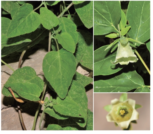 ●描述:多年生草本。茎缠绕,有多数分枝,小枝具叶,不育或先端着花。叶在主茎及侧枝上的互生,在小枝上的近对生,卵形或窄卵形,端钝或微尖,基部近心形,边缘具波状钝锯齿,分枝上叶渐趋狭窄,基部圆或楔形。花单生枝端,与叶柄互生或近对生,有梗;花萼贴生至子房中部,萼筒半球状,裂片宽披针形或窄长圆形;花冠上位,宽钟状,黄绿色,内面有明显紫斑,浅裂,裂片正三角形,全缘;柱头有白色刺毛。