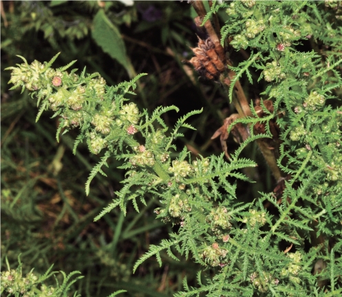 ●描述:一年生草本。基生叶密集成莲座状,长椭圆形,二回栉齿状羽状分裂,每侧裂片20余枚,小裂片具多枚栉齿;茎下部与中部叶长椭圆形,二回栉齿状羽状分裂,每侧裂片5~10个,具小裂片,两侧密被细小锐尖栉齿;上部叶与苞片叶一回栉齿状羽状分裂。头状花序半球形或近球形,在花序分枝上排成密穗状花序,在茎上组成密集窄圆锥花序,总苞片边缘紫褐色,膜质;花序托凸起,半球形;雌花3~8枚;两性花15~30枚。