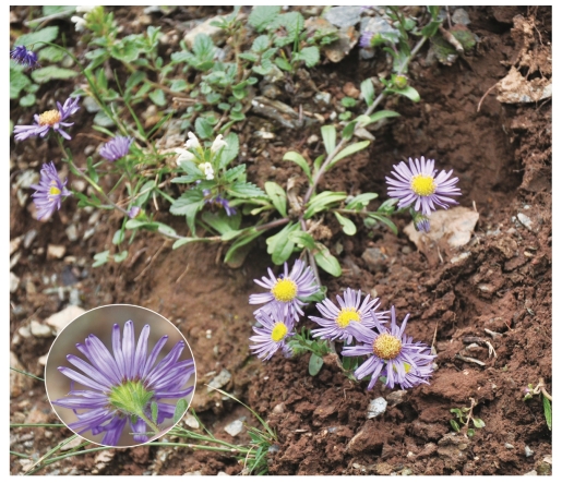 ●描述:一年生草本。茎直立,常自中部分枝。基部及下部叶卵形或倒卵状矩圆形,顶端钝或急尖,边缘有粗圆齿,具3条脉;中部茎生叶狭矩圆形,顶端钝或急尖,上部边缘有粗齿或全缘,上面绿色,下面浅绿;上部叶渐小,披针形至条状披针形。头状花序单生枝端,基部有苞片状小叶;总苞半球形,总苞片2~3层;舌状花舌片蓝紫色,条状矩圆形,顶端3裂或全缘;管状花黄色,裂片5枚。