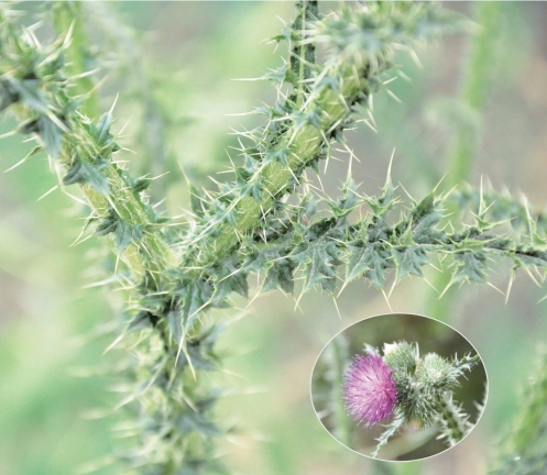●描述:二年生或多年生草本。茎直立,有条棱。下部茎叶椭圆形、长椭圆形或倒披针形,羽状深裂或半裂,侧裂片7~12对,边缘有大小不等的三角形或偏斜三角形刺齿,齿顶及齿缘或浅褐色或淡黄色的针刺,或下部茎叶不为羽状分裂,边缘大锯齿或重锯齿;中部茎叶与下部同形但渐小,最上部茎叶线状倒披针形或宽线形;全部茎叶两面明显异色,上面绿色,下面灰绿色或浅灰白色,两侧沿茎下延成茎翼。头状花序常3~5个集生于分枝顶端或茎端;总苞片多层,覆瓦状排列;小花红色或紫色。