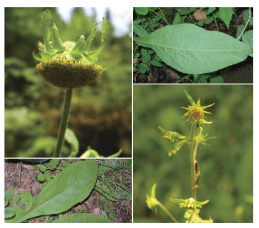 ●描述:多年生草本。茎下部叶椭圆形或匙状椭圆形,近全缘,有腺体状胼胝或具小齿,上面被基部膨大倒伏柔毛,下面被白色疏长柔毛,两面有腺点;上部叶椭圆形或椭圆状披针形。头状花序单生茎、枝端或腋生,花序梗较长,花时下垂;苞叶5~7枚,披针形,反折;总苞盘状,苞片4层,外层披针形,上半部草质,下部干膜质,背面被柔毛,常反折,中层披针形,内层线状披针形;两性花筒部被白色柔毛,冠檐漏斗状,5齿裂;雌花窄漏斗状,冠檐5齿裂。