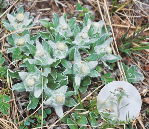 ●描述:多年生草本。垫状丛生,有顶生的莲座状叶丛,疏散丛生或散生。茎直立,草质,被白色棉状厚茸毛。基部叶在花期生存;茎部叶较莲座状叶稍长大,直立或稍开展,匙形或线状匙形,顶端有隐没于毛茸中的短尖头。苞叶少数,直立;头状花序常单生或3个密集;总苞被灰白色绵毛;总苞片4~5层;雄花花冠有小裂片;雌花花冠细丝状,花后增长。