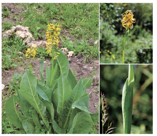 ●描述:多年生灰绿色草本。丛生叶和茎基部叶具柄,柄全部或上半部具翅,翅全缘或有齿;叶片卵形、椭圆形或长圆状披针形,先端钝或急尖,全缘至有齿,边缘有时略反卷,基部楔形,有时近平截,突然狭缩,下延成翅柄,两面光滑;茎生叶小,卵形、卵状披针形至线形,先端急尖至渐尖,常筒状抱茎。总状花序密集或上部密集,下部疏离;苞片线状披针形至线形;头状花序辐射状,常多数,稀单生;小苞片丝状;总苞片10~14枚,2层;舌状花5~14个,黄色,舌片线形。
