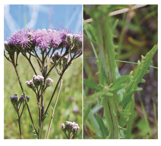●描述:二年生草本。茎无翼,稀有翼。基生叶与下部茎生叶椭圆形或披针形,羽状深裂,裂片7~8对,长椭圆形、斜三角形、线状披针形或线形,裂片全缘,极稀疏生大齿,叶柄有窄翼;中部叶有短柄,上部叶浅羽裂或不裂;叶两面绿色,密被黄色腺点。头状花序排成伞房状或伞房圆锥花序;总苞窄钟状或圆柱形,疏被蛛丝状毛,总苞片6层;小花紫色。