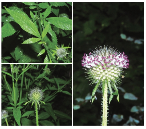●描述:多年生草本。茎具4~6棱,棱具钩刺。基生叶具长柄,长椭圆形,分裂或不裂;茎生叶对生,椭圆状卵形或长椭圆形,先端渐尖,基部楔形,常3~5裂,顶裂片最大,裂片基部下延成窄翅,具粗齿或近全缘,有时全为单叶对生,上面被白色短毛,叶柄和下面脉上均具疏钩刺和刺毛。头状花序圆球形;总苞片线形,具白色刺毛;苞片倒卵形,两侧具长刺毛;花萼盘状,4裂;花冠常紫红色,漏斗状,4裂;小总苞具4条棱,顶端具8枚齿。瘦果长圆楔形。