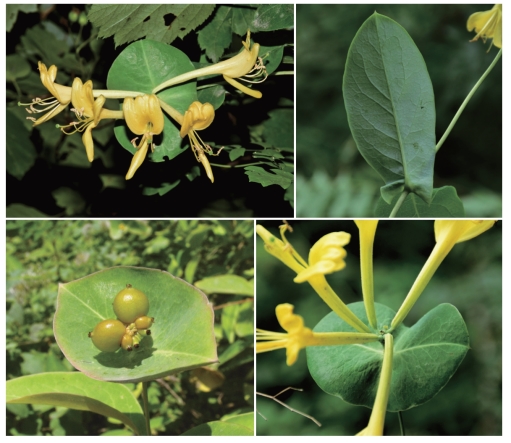 ●描述:落叶藤本。叶纸质,长圆形或卵状长圆形,稀椭圆形,下面粉绿色;花序下方1~2对叶连合成近圆形或圆卵形的盘,盘两端通常钝形或具短尖头。由3朵花组成的聚伞花序密集成头状花序生小枝顶端,有6~9朵花;萼筒壶形,萼齿三角形或卵形;花冠黄至橙黄色,上部外面略红色,唇形,冠筒稍弓弯,内面疏生柔毛;雄蕊着生唇瓣基部,无毛;花柱伸出,无毛。果熟时由黄至红黄色,后深红色,近圆形。