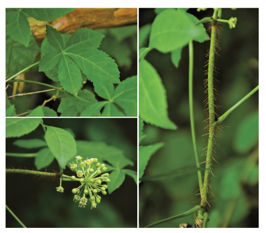 ●描述:灌木。有时蔓生状。节上有刺1至数个或无刺,稀节间散生多数倒刺;刺细长,基部不膨大,下向。叶有小叶5枚;小叶片纸质,长圆形至披针形,或倒披针形,稀倒卵形,先端渐尖,稀尾尖,基部楔形,边缘有锐利重锯齿伞形花序单个顶生,或数个组成短圆锥花序,有花多数花绿黄色;萼边缘有5枚小齿;花瓣5枚,长卵形,开花时反曲;雄蕊5枚;子房5室,花柱全部合生成柱状。果实卵球形,有5条棱,宿存花柱短。
