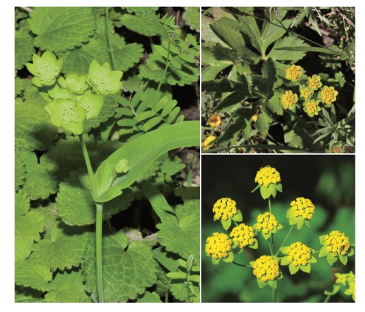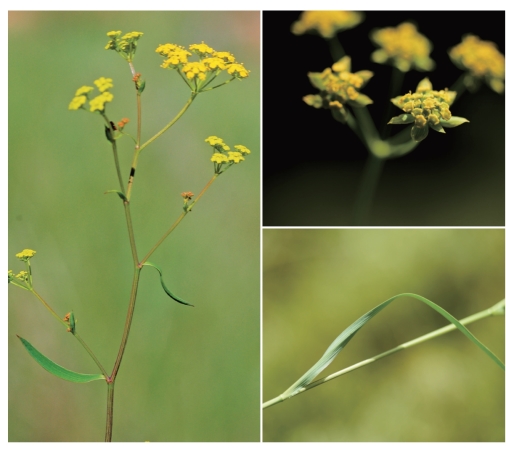 ●描述:多年生草本。数茎直立或斜升,粗壮。基部叶丛生,狭长圆形或长圆状披针形或倒披针形,顶端钝或急尖,有小突尖,基部渐狭成叶柄,叶基扩大抱茎;中部的茎生叶狭长圆形或倒披针形,下部较窄成短柄或无柄,顶端短渐尖,基部抱茎;序托叶长卵形,基部扩大,有时有耳。总苞片1~2枚或无;伞辐4~9条;小总苞片6~9枚,卵形至阔卵形,顶端有小短尖头,黄绿色;花瓣黄色,有时背面带淡紫红色。果棕色,卵形,棱薄,狭翼状;每棱槽内油管3条,合生面3~4条。