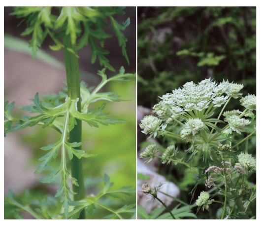 ●描述:多年生草本。茎直立,粗壮,有条棱。基生叶和茎下部叶有长柄,叶片轮廓卵形,近三出式3回羽状分裂,末回裂片披针状长圆形,边缘有不整齐缺刻;茎上部的叶简化,仅托以叶鞘。顶生复伞形花序有短的花序梗,花都能育;侧生复伞形花序不育;总苞片8~12枚,狭长圆形,顶端3~5裂,边缘白色;伞辐多数;小总苞片8~10枚,全缘或顶端3浅裂,有宽的白色边缘;花多数;花瓣白色,基部明显有爪;花药暗紫色。果实椭圆形,主棱波状,侧棱翅状,每棱槽中有油管1条。
