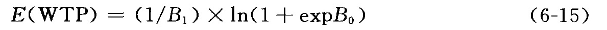 式中B1是估计的最大金钱支付数量对回答“是”概率的影响系数。如果回归方程中没有其他独立变量的影响,则B0是估计方程中的常数项;如还有其他独立变量的影响,则B0是常数项与其他独立变量的回归估计系数与其平均值乘积的和。平均WTP的置信区间的计算,可以采用方差-协方差矩阵和Park等提出的模拟方法。