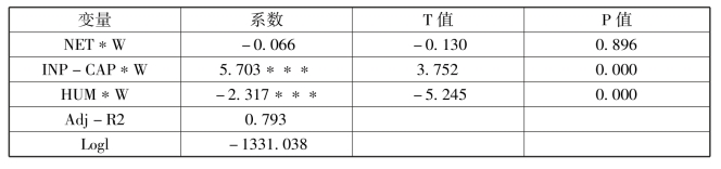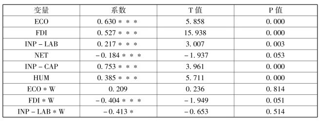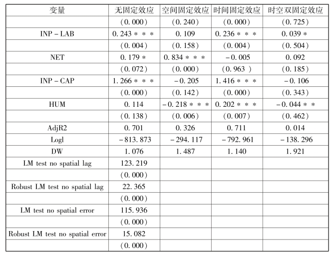 由最小二乘法中时间固定效应得到的回归结果可知,模型的R2为0.711,具有较高的拟合优度。解释变量中通过显著性检验的变量有ECO、FDI、INPLAB、INP-CAP及HUM,且均表现为解释变量的正向作用,相关系数显示研发部门资本投入对被解释变量具有最大的正向贡献作用,NET表现为解释变量的负向作用,且没有通过显著性检验,可能是由于没有考虑到地理区位的因素导致,可在空间计量模型中进一步检验。