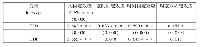 首先运用普通最小二乘估计方法对标准面板数据计量模型进行估计,得到模型估计结果见表1-7。