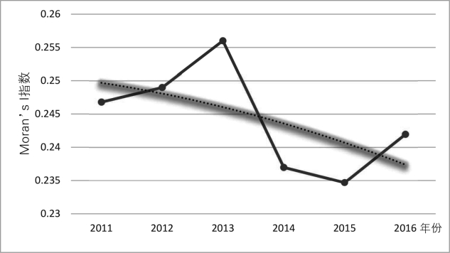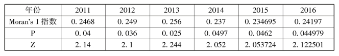 由表2-10和图2-11可见,2011年至2016年长江中游地区城市创新能力与新型城镇化水平的耦合协调度Moran's I指数存在一定波动,最小值为2015年的0.234695,最大值为2013年的0.256,均为正值。P值皆小于5%,表明本研究的全局空间自相关Moran's I值的显著性通过了检验,但整体的置信度偏低。这表明从空间关联上来看,长江中游地区两大系统的协调发展关系呈现一定程度的正向相关性但该种相关性较低。也就是说,长江中游地区区域内,城市创新能力与新型城镇化水平的耦合协调度值高的城市与一样为高值的城市互相邻近。且2011年至2016年长江中游地区两大系统耦合协调度的全局Moran's I指数一直处于小幅度波动状态,空间自相关Moran's I统计量总体呈下降走势,说明长江中游地区两大系统耦合协调性的在空间上的关联性不稳定且呈越来越弱的趋势。