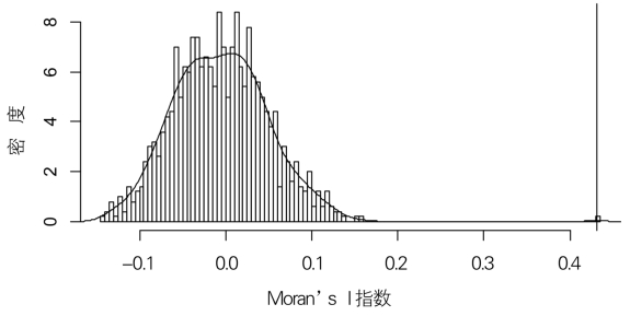 图2-12显示了在随机排列下模拟的Moran's I指数分布图,可以发现其大致呈正态分布,1000次模拟实验生成的Moran's I指数均小于实际观测数值,即p值小于0.05,即空间不相关发生概率小于5%,故可以拒绝零假设,说明观测数据存在微弱的空间自相关。