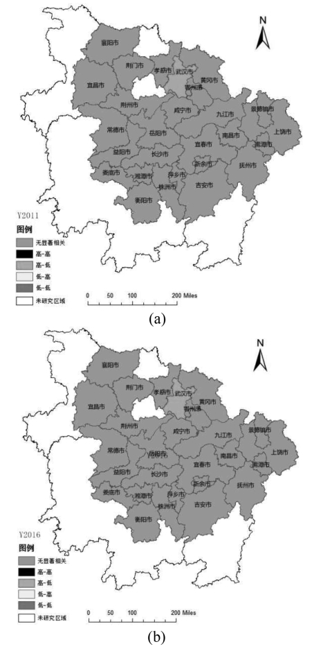上节已从整体的视角出发对长江中游地区的城市创新能力与新型城镇化水平耦合协调性在空间上的关联做了全局空间自相关分析。接下来本研究将研究单元转为长江中游地区内的各城市,对各城市两大系统的耦合协调性的空间关联进行局部空间自相关分析。依据局部Moran's I的定义,结合长江中游地区城市创新能力与新型城镇化水平的耦合协调度数据,利用ArcGIS制作LISA集聚图。2011年和2016年城市创新能力与新型城镇化水平协调发展LISA空间格局见图2-13。本研究的LISA集聚图依据Moran's I值的不同将长江中游地区28个主要城市分为了5类:无显著相关代表该城市的耦合协调性和它周边的城市没有相关关系;高高表示该城市自身的耦合协调水平很高且其邻近的城市耦合协调度值也很高;高低指代的是该城市自身的耦合协调水平很高但其周围的城市耦合协调度值却很低;低高示该城市虽然自身的耦合协调水平很低但其邻近的城市耦合协调度值很高;低低代表的是不仅自身的耦合协调性很低且其邻近城市单元的耦合协调水平也很低的城市。由图2-13可见,从2011年到2016年,长江中游地区城市的LISA图没有发生明显变化,除武汉市外的其他城市创新能力与新型城镇化水平的协调性并无明显相关。表明经过6年的发展,长江中游地区创新能力与新型城镇化水平的协调格局没有发生较为明显的改善。大部分地区都没有呈现显著的集聚特征,因为三个次级城市圈发展存在参差不齐的空间格局,各城市间没有形成良好的空间互动与空间外溢作用。武汉市表现为高低集聚,即自身协调性水平很高,而周边区域的协调性都普遍较低,这也和之前解释的武汉市的区位锁定效应和灯影效应相呼应,由于武汉市自身各方面发展都相对靠前,固化有许多发展资源,优秀的人才及其他物质资源等不易流出,导致邻近区域发展较为缓慢。未来应加大各次级城市群间的内部联动,进一步制定机制激励,发挥优势。与此同时,发挥核心城市的带头和外溢作用,加强各城市间相互联系与作用,形成组团优势共谋发展。