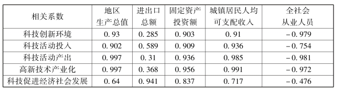 在进行五大创新系统与区域经济外部协调性分析时,主要利用的是皮尔逊系数。这里选用了地区生产总值、进出口总额、固定能够资产投资额、财政居民人均可支配收入与全社会从业人员五个指标代表区域创新外部发展;以地区生产总值表示区域经济实力、进出口总额反映区域外贸实力、以固定资产投资反映区域基础设施实力、城镇居民人均可支配收入是反映民生实力、全社会从业人员反映就业实力。从表3-23可以看出,科技创新的五大系统与经济指标都存在互相促进关系,仅仅与全社会从业人员这一指标存在抑制作用。在以上协调层次的基础上,在此协调分析中多了不协调发展即负相关,在此关系中两者之间相背而驰,不协调发展明显。因此,处于高度协调发展的有科技创新活动系统、科技活动投入系统、科技活动产出系统、高新技术产业化系统分别与地区生产总值、固定资产投资、城镇居民人均可支配收入,相关度都在0.9以上;科技促进经济社会发展与进出口总额;处于中度协调发展的是科技促进经济社会发展系统与固定资产投资、城镇居民人均可支配收入,相关度在0.7到0.9之间;处于一般协调发展的有科技创新环境系统、科技活动投入系统、科技活动产出系统、高新技术产业化系统分别与机进出口总额以及科技促进经济社会发展与地区生产总值,相关度在0.7到0.9之间;而五大创新系统分别与全社会从业人员都处于不协调发展,相关度为负数。