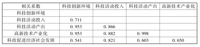 科技活动产出与其他系统协调度依次为:高新技术产业化系统、科技创新环境系统、科技活动投入系统与科技促进经济社会发展系统。较好的科技生态发展系统即为科技活动投入与科技活动产出呈正向促进关系。而高新技术产业化、科技创新环境优化与科技促进经济社会良好发展从一定程度上说属于科技活动的产出成果,因此与科技活动产出保持着分别为0.998、0.953、0.603的协调关系。其中高新技术产业化发展与技术性论文、专利以及技术成交这些科研成果都保持接近1的高度协调发展。从一定意义上说,良好的科技创新环境促进科技活动的产出,良好的科技创新环境包括有大量的科研技术人员、大量的科研物质条件以及社会各界对科学技术的重视,这些保证了科研活动的繁荣与发展,从而保证科研成果的大量产出。科技活动产出系统与科技促进经济发展系统保持着一般协调发展程度,这是因为在《全国区域科技创新报告》中的科技活动产出包含科研成果的指标,而科技促进经济社会发展主要从真实的人民生活质量改善而设立的评价标准,科研成果与改善人民生活之间还需要科研成果运用、科研成果推广以及科研成果测评等一系列措施,因此两者之间直接联系较小。